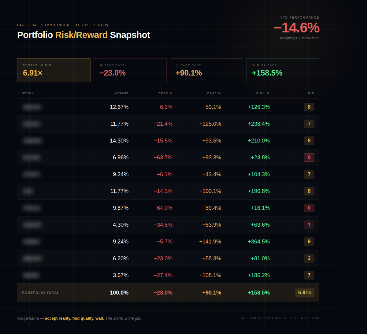 This infographic shows the risk-reward (built with my methodology) for each of my 11 holdings, plus a blended view for the entire portfolio:
